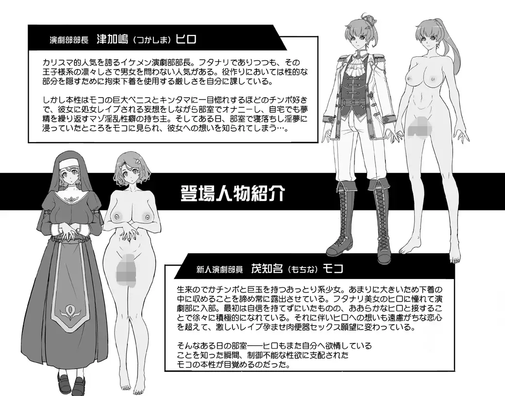 巨根フタナリ演劇部員のモコは同じフタナリながら王子様と皆から慕われる部長のヒロに恋していた。